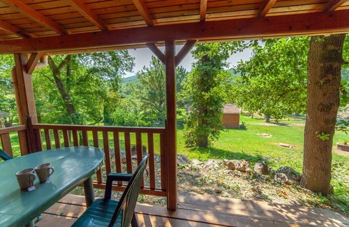 They can also rent in the same place, one of the 17 fully equipped wooden bungalows. They are located in a small oak forest near the campsite and have an extraordinary view over the Pyrenees.
