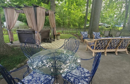 Rustic elegance at its best. A great retreat with a mix of both, log beamed ceilings and rustic characteristics yet chandeliers in the bedroom and elegant dining area with character throughout the home. Wooded back yard with dining area, fire pit, seating area and hot tub under a pergola. Property is located at Clarklake a public lake and access for swimming/boating can be gained at the public access a few minutes away. This location is wonderful to take walks or biking with a 7 mile trail around the lake. Cabin is great for a romantic getaway, bachelorette party, or just hanging out. There are wineries and breweries within 15 minutes. There is a front entry door bell camera that does NOT record continuously does not record sound and it only shows the front door area.