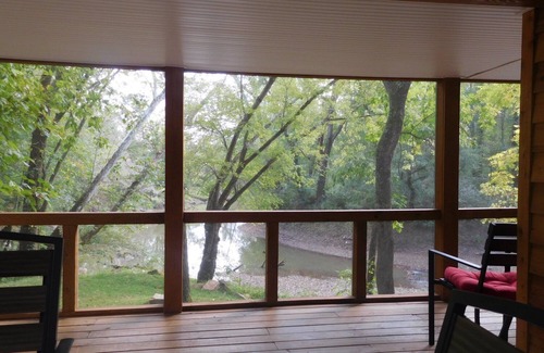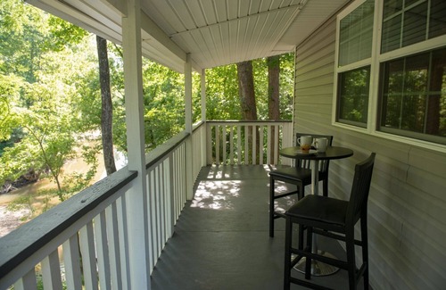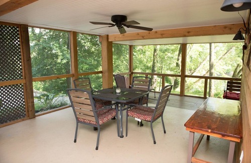 The Cabin is known for its setting on the bend of Triplett Creek. The view is always relaxing and especially enjoyed from the screened-in porch on the ground floor. The studio living area on the second floor features a queen bed, full futon sofa bed, kitchen, table and chairs, separate bathroom with shower/tub unit and washer/dryer. There is an outdoor picnic table with fire pit and seating.