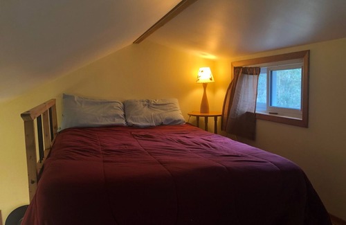 This custom built cabin is nestled amongst the pine trees on out 3 acre family property near Rideau Ferry, three minutes from Big Rideau and Lower Rideau Lakes. The cabin has a small living area downstairs with couch, work desk and small kitchenette complete with beautiful glass door woodstove to keep you cosy on the colder nights. Sleeping quarters are up in a loft above. Access is by ladder and head clearance is 48" in the middle so you need to be comfortable moving around on your knees. Bathroom access is 25 metres away inside the main house. Please note that while you have the cabin to yourself, the cabin is opposite our family home and we have three young boys who may be playing in the yard. Also, there is no plumbing to the cabin, but there is a sink with running water under gravity.
