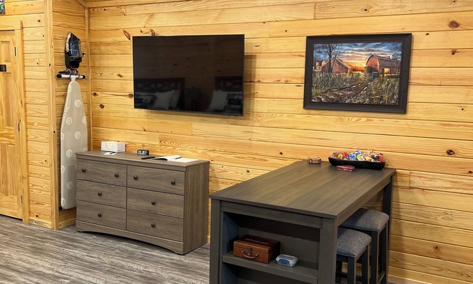 Welcome to Bluff Creek Cabins. We have 4 cabins that are ready for reservations. Bluff Creek Cabin #3 is an open floor plan except for the bathroom which is private in your cabin. It is designed to sleep 4 people. There are 2 queen size beds, couch, tv, small table and kitchenette. The kitchenette has a fridge, microwave, coffee pot (1 pack of coffee included for each day with creamer and sugar), small air fryer toaster oven and an electric skill to be able to cook inside. Outside the cabin we have a charcoal grill (charcoal not included) but BBQ utensils are provided and a private picnic table. There is a building on the property call the "Community Hall" that has a kitchenette, bathroom with a walk-in shower, 2 washers and 2 dryers (soap not included) and living room with table and 4 chairs and tv. We also have a designated community area outside with a picnic table and fire pit (wood not included) for your evening relaxation.