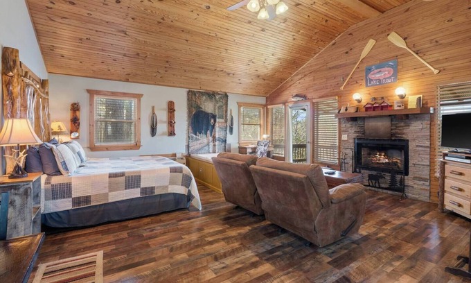 Perched above the White River and Inspiration Valley, this cozy 1BR cabin is made for romantic escapes. Soak in the large jacuzzi tub, relax by the wood-burning fireplace, and take in breathtaking views from your private back deck. Enjoy a king bed, walk-in shower, comfy seating, Dish TV, and WiFi. The kitchenette is stocked for quick meals and morning coffee. Just 10 min to Eureka Springs and Beaver Lake, it’s the ideal spot to relax, explore, and soak in the Ozarks’ natural beauty.