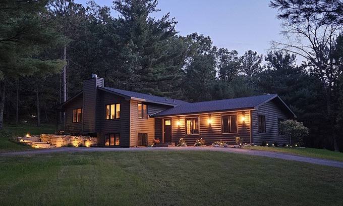 Newly remodeled cabin on 6 acres with own climbing rock, heated swimming pool, hot tub and game room. Come relax at this serene place. Minutes away from hiking trails. 20 minutes away from Wisconsin Dells fun.