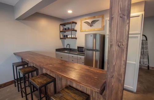 The Top Level - also the "main level," features an open floor plan with vaulted tongue-in-groove ceilings and exposed beams. The primary Kitchen, freshly-renovated, has granite countertops, high-end stainless appliances, plenty of cabinet and countertop space for storage and preparing meals for large groups. There are 5 bar stool seats at the kitchen peninsula bar top. Adjacent to that is the open dining area with a custom-crafted banquet-style dining table which seats 13 guests. Including the adjacent bar stool seats, Blue Eagle can dine up to 18 people together. The Living Room features a stone gas log fireplace, a large HD Smart TV, and comfy leather furniture. The open-air rear deck offers a gas grill, outdoor dining table, Adirondack-style seating, and seasonal winter mountain views. Wall-to-wall oversized windows and glass doors allow sunlight to flood into the main Living and Dining areas as well as the Kitchen. A King bedroom suite with HD Smart TV and full ensuite bathroom with a tub and shower completes this level.