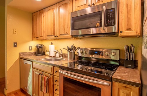 This cabin is entered through the living room which offers an open floor plan complete with kitchen, living room, and dining room. The kitchen is fully stocked with dishes, pots, pans, utensils and cookware to use during your stay. Also in the kitchen is a large closet to store pantry items and where the washer and dryer is located. Three high top chairs are located at the bar area in the kitchen and the dining room has seating for four. The living room has a gas fireplace, 55" mounted TV, 2 swivel chairs, and a sofa lounger which lowers to offer additional sleeping accommodations for 2 guests. The 2 bedrooms are on opposites sides of the home which offer privacy.