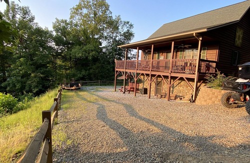Beautiful Buck Mountain cabin sitting privately on top of 5 acres with long range mountain VIEWs to watch both sunrise and sunset from the wrap around covered porch. Sit by the gas firepit and enjoy the view. 4 step entry into 1st floor with kitchen, dining, family and ensuite master bedroom. Downstairs is the second bedroom with a queen size bed and bunk bed, full bath, laundry room. Buck Mountain has so much to offer...hiking trails, waterfalls, stocked fishing pond all within a private gated community. Wifi high speed internet and cell phone service!