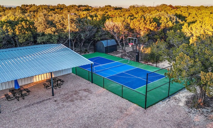 Come relax & have fun with friends and family on 16 acres! Enjoy the hot tub with a view of beautiful hill country, play pickleball or basketball on the sport court, adventure up the 3 story treehouse, grill out & let the kids play on the playhouse & outdoor mud kitchen! Check out the game building featuring classic arcade games, ping pong, shuffleboard, foosball, & more! End the day with a bonfire or relaxing in a hammock on the porch. The perfect getaway!