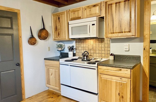 Inside the home you will find floor to ceiling windows which give seasonal views in the winter and a tree house feeling in the summer. The living room offers a beautiful wood-burning fireplace faced with stones that were collected from the property. The couch and loveseat will comfortably fit a large family for a movie or friendly board games by the fire. There is a dining table to accommodate seven and a spacious, well-equipped kitchen to prepare meals. For morning coffee, there is bar area with seating for two or plenty of seating on the front porch where you can watch the sun rise over the mountains. Excellent wi-fi is provided and TVs are equipped with ROKU streaming devices. A stacked washer/dryer is also available in the home.