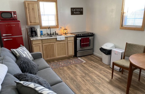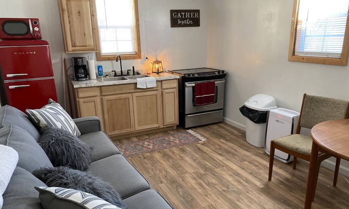 This rustic cabin includes one bedroom with a queen bed and a living room with a sleeper sofa. smart tv and WIFI. Kitchenette with a range, refrigerator, microwave and coffee pot and a outdoor firepit. Towels and linens are included.