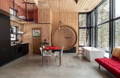 Experience the epitome of self-sufficiency with our original Zoobox cabin, powered entirely by solar panels. Your stay promises an immersive adventure, complete with a range of playful amenities. Scale our indoor climbing wall, indulge in a game of giant bag toss, or take a thrilling descent down the fireman's pole from the mezzanine. Satisfy your culinary desires by grilling feasts on the barbecue and basking in the warmth of the outdoor fireplace. For those seeking a bit of physical activity, harness your energy in a giant electricity-generating hamster wheel. Afterward, unwind by swaying in our suspended hammocks, taking in the serene surroundings. Enjoy the embrace of comfort with a king-size bed gracefully descending from the ceiling, two cozy double mattresses, a fully equipped kitchen, a bath on wheels, and an invigorating outdoor shower. Nestled in the heart of nature, this cabin seamlessly melds comfort and delight, creating the perfect sanctuary for couples and small families in search of relaxation, adventure, and pure enjoyment.