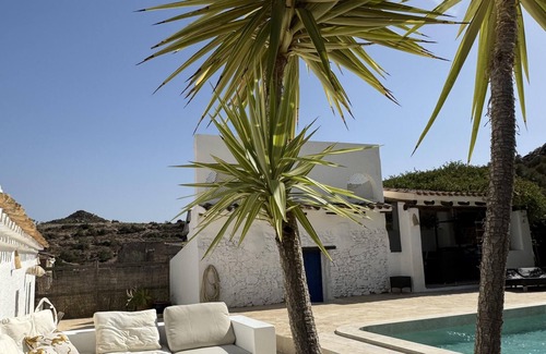 Rural Almeria holiday home in the middle of nowhere, no neighbours, no noisy roads, just breathtaking views, almonds, olives, an outdoor pool, slight breeze and the echo of the goat bells in the hills twice a day. It can accommodate 8 people, or 10 if people are happy to share queen beds.
