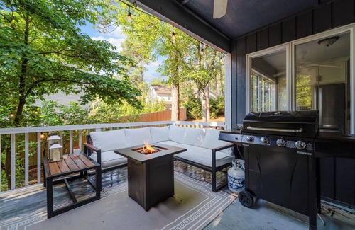 Your stay at Calhoun Clubhouse comes with a variety of amenities designed to ensure your comfort and relaxation. Enjoy spacious sleeping arrangements, including a luxurious king bedroom with an ensuite bath, alongside two additional queen bedrooms sharing a full bathroom. Gather on the beautifully furnished deck featuring a fire pit, propane grill, and outdoor dining options for memorable moments under the stars. The fully equipped kitchen is perfect for preparing meals together, while other conveniences like high-speed Wi-Fi and a smart TV enhance your time spent here.