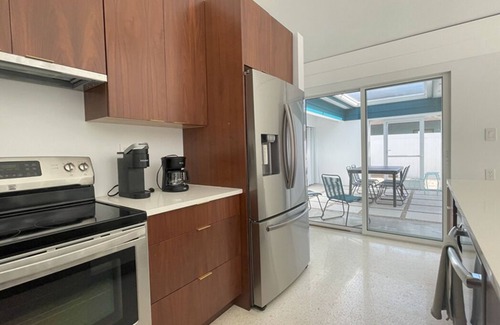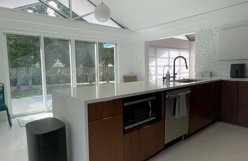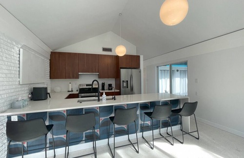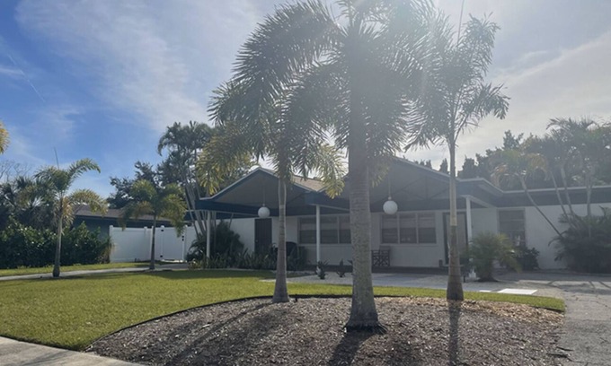 Fully remodeled mid-century modern retreat. Designed with minimalism in mind, this house provides a calming escape from all the chaos in our daily lives. The kitchen is large and fully stocked with basic cookware and has an attached screened in courtyard to enjoy dinner outside. The courtyard also has a full size washer and dryer and a second refrigerator for additional food or drinks. While the bedrooms are smaller in size, they provide a cool and cozy place to fully relax free from technology and distraction. All bedrooms provide ample closet space and each has a fan. The only TV in the house is in the living room. The backyard provides natural privacy with mature trees. The neighborhood is quiet and great for morning or evening walks among the giant trees of Fontana Lane. Anna Maria Island is about a 10-15 minute drive away depending on beach traffic.