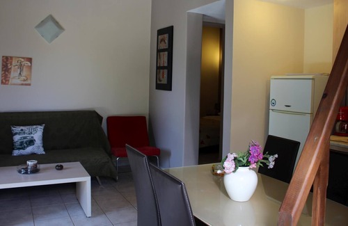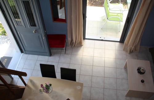 The well-kept holiday house VASSIA 3 is located between VASSIA 1 and 2, slightly offset to the back in a distance of approx. 5-10mtr. This is a modern, friendly and functionally furnished holiday house. The bedroom, bath and open kitchen area are on the ground floor. A steep staircase leads to the open gallery above the living area. From the living room you have direct access to the roofed terrace and the garden.