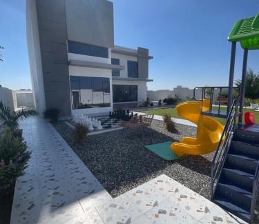 13 miles from Nizwa Fort in Ţaymissah, calm chalet گالم شالية features accommodations with access to a public bath. This property offers a private pool, free Wifi, and free private parking. The indoor pool features a pool bar and fence. Providing a balcony and mountain views, the spacious chalet includes 2 bedrooms, a living room, satellite flat-screen TV, an equipped kitchen, and 4 bathrooms with a walk-in shower and a hot tub. The air-conditioned unit at the property features a bidet and a dressing room. For added privacy, the accommodation has a private entrance and soundproofing. A mini-market is available at the chalet. For guests with children, the chalet provides kids pool and outdoor play equipment. A car rental service is available at calm chalet گالم شالية. Muscat International Airport is 91 miles away, and the property offers a paid airport shuttle service.