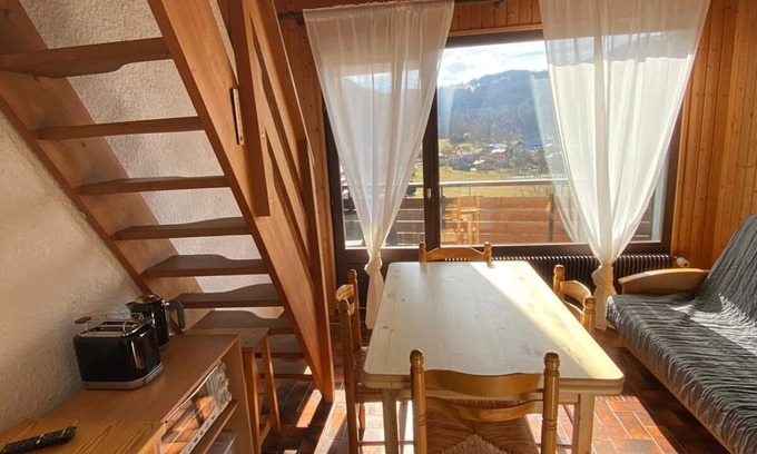 quiet residence facing south west, enjoy a family area with mountain views, it consists of a mezzanine for parental sleeping. the living room is equipped with a double sofa bed. An alcove with two bunk beds completes the layout. You will have access to the mountain and the ski area 2 minutes away. local shops can be reached on foot in 5 minutes. Evian and Lake Leman 10 minutes away.