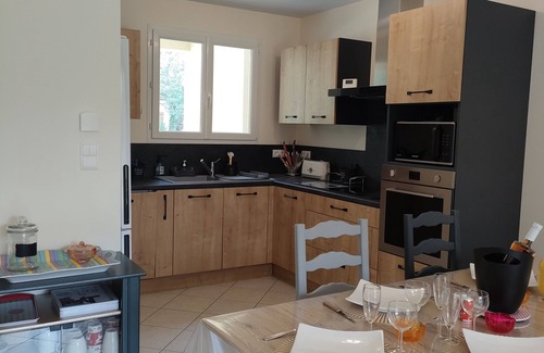 Le logement se situe dans un quartier résidentiel très calme, entre champs et bois, à quelques minutes en voiture du village et du plan d'eau communal et proche de la vélo voie verte pour des balades à pieds, rollers ou vélos.