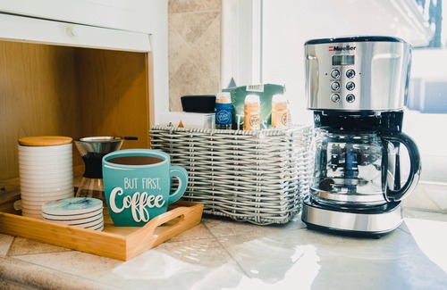 * Kitchen is fully stocked with cooking essentials (condiments, spices, oil) and various appliances (stove, oven, toaster, rice cooker, air-fryer, Brita water filter pitcher, coffee maker, electric kettle, waffle maker), and a complimentary Coffee/Tea Station.