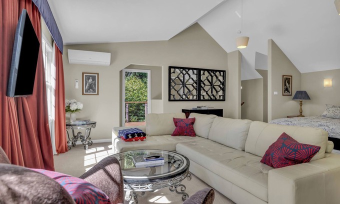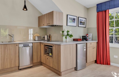 Camellia Lodge is filled with natural light and has an open plan living with a split system heating, heated floors in the bathroom, kitchen, lounge and a comfortable King Size Bed. It also features wonderful views of the gardens from its balcony.