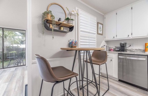 The kitchen is fully stocked with everything you need to prepare a delicious meal, whether you're whipping up a quick breakfast or cooking a full dinner. Enjoy your meals at the high-top dining table for two, a perfect spot for intimate dining or morning coffee.