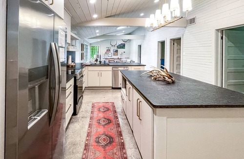 With a wide landscaped riverbank, this property is ideal for sunbathing and fly-fishing alike. There are no other cabins across the way and plenty of elbow room on the double shaded lot. MASTERFUL renovation inside and out Spring 2024. This place has comfort and soul + a gourmet lux kitchen featuring induction cooking. Within a couple of minutes are several public launches and hikes. (see Big Creek Rec area - oh wow). Choices of several nearby trout guides can come and pick you up on your dock. FIBER internet!