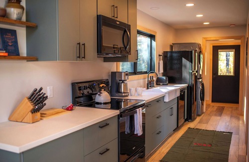 Love to cook? We've got you covered! The kitchen boasts plenty of storage for food items and is completely stocked with whatever you might need to make a delicious meal. There is also a grilling & seating area on the patio for those warmer months and a grate over the firepit if you want that full camping experience without having to pitch a tent. Rainy or windy? No problem, we have you covered (literally) there, too! Our cozy and comfortable screened-in porch includes soft/dimmable lighting and a ceiling fan. Thoughtfully decorated with modern nordic/scandinavian spirit, you'll find beautiful