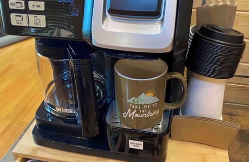 We provide a complete coffee setup too: electric kettle, Keurig, drip coffee maker and French press, plus an assortment of pods, whole beans and some tea packets are here to enjoy.