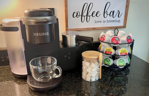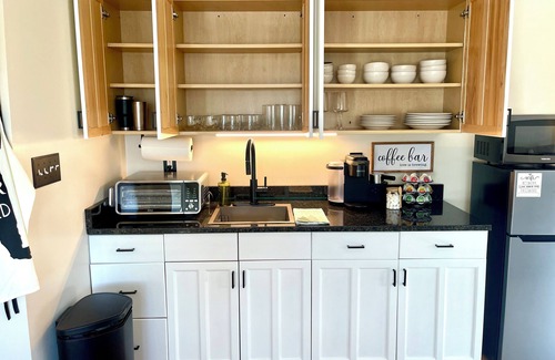 Enjoy the open and spacious studio suite that has it all! The living space includes an electric fireplace, 68 inch smart TV, soundbar, Amazon Echo Dot smart speaker, and large cozy couch with chaise so you can kick your feet up and relax. The “bedroom” nook includes a queen sized bed with fresh cotton sheets and comforter, throw blankets, and two side tables with a portable fan, alarm clock, and plenty of accessible charging ports. Full bathroom includes a standup shower with rain shower head and sprayer nozzle, luxury bath towels and washcloths, and lavish bathing essentials (shower gel, shampoo, and conditioner). The kitchenette includes a refrigerator, microwave, toaster oven/air fryer, latte/cappuccino maker, and a small dining table for two and/or small workspace.