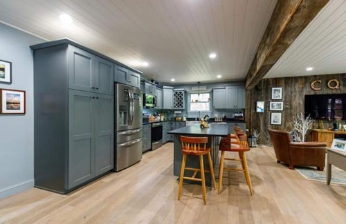 With 100 feet of water frontage on beautiful Wilson Lake in Wilton, Maine you can hear the cry of the Loons, have a coffee on the spacious deck or hop in a kayak. This lovely 3-bedroom, 3 1/2 baths has reclaimed barnboard throughout the open concept cottage. A game room with an 80-inch TV, pool table, 18-ft. Shuffleboard and much more. There are kayaks, paddle board and a sandy beach. Plenty of parking for many vehicles. Wilton is within an hour of Sugarloaf & Sunday River ski resorts.