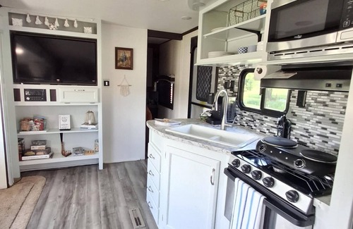 Welcome to Camp Wee Acres in Sparta. This cozy RV features high speed wifi to run all your devices, 1 bedroom - with a queen bed and the other sleep area has a full size bunk bed. With heating and AC, you'll stay comfortable no matter the season. At night sit by the firepit and star gaze. (firewood supplied)