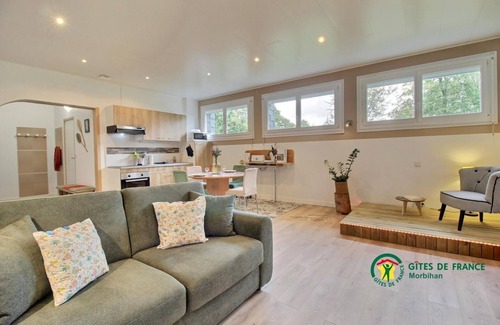 On a plot of 3000m²: apartment on the 1st floor of a building without elevator including: - Entrance with office - Kitchen open to living room, living room - Bedroom with 140x190 bed - Separate WC Exterior: Large shared garden with dining table, parasol and deckchairs. Car park Building including two other gîtes (56G193 and 56G190). Shared: garden and parking. Bright and warm, the cottage welcomes you in a refined atmosphere with soft tones. Between forests, meadows and streams, you are in the right place to recharge your batteries. As soon as you arrive, you will feel a relaxed and peaceful atmosphere, far from the hustle and bustle of the world. The rental is in the heart of the Pontivy region and just 1 km from the town of Reguiny and its local shops. This gîte is the ideal starting point for discovering 3 prestigious tourist destinations: Brocéliande, Cœur de Bretagne and Gulf of Morbihan. Magali and Antony, the owners, will welcome you with open arms and will be happy to help you discover the many natural and cultural riches of Brittany. To see: Rohan, a pretty town nestled against a cliff, Bréhan and the Abbey of Timadeuc, Pontivy and its magnificent architectural heritage or even Josselin and its castle. Rental equidistant from the Morbihan South coast and the Côtes d'Armor.