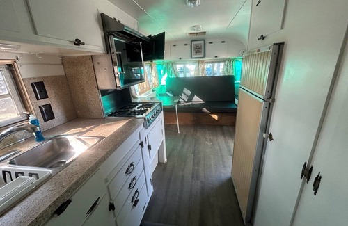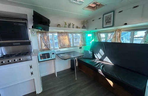 This retreat features two eclectic kitchens, complete with a stove, microwave, and refrigerator. With a maximum capacity of eight guests, unwind in the bedroom furnished with a queen bed, while additional sleeping arrangements are provided by the convertible sofa bed in the living room. Indulge in the stylish bathroom with a shower and enjoy the cozy ambiance maintained by air conditioning throughout the home. The second camper offers two twin beds, kitchen, living room with sofa bed and bathroom with shower.