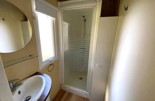 The mobile home offers a bathroom equipped with a shower and a sink, so