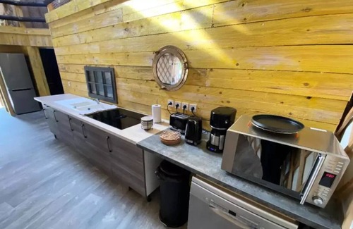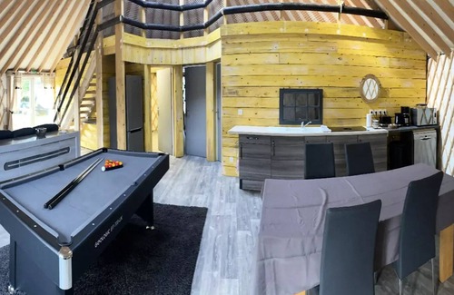 With his 100 m2, The yurt has a lounge area with sofa, TV, billiards, and a large table for 8 people. The equipped kitchen (microwaves, hobs, refrigerator, dishwasher, Tassimo coffee maker, etc.) allows you to prepare your meals independently. On the sleeping side you will find 2 bedrooms with double beds and a wooden mezzanine with 2 double beds (140x190 cm). The bathroom includes a shower, sink and toilet. Heating, air conditioning and Wi-Fi are included.