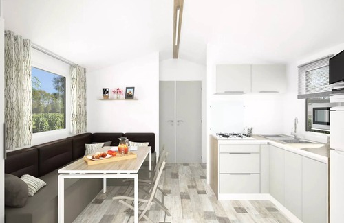 Equipment: The Mobile Home includes a kitchen area equipped with fridge/freezer, 4-burner hob, microwave, electric coffee maker, kitchen utensils and crockery adapted to the number of people in the accommodation. The terrace has garden furniture. Pillows and blankets are provided for each bed.