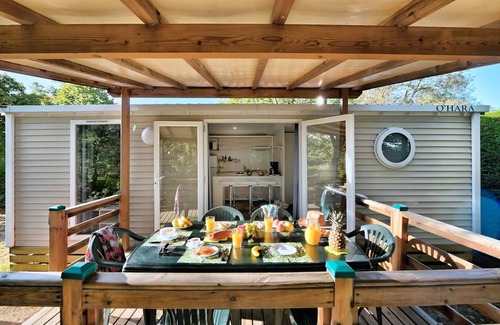 Accommodation: With an area of 29m2 with 2 separate bedrooms around a central living area and a cocooning lounge area that can form a "3rd bedroom", our Mobile-Homes can accommodate 4 to 6 people in all comfort and are equipped with air conditioning. You will be like at home: cooking fires with hood, large refrigerator freezer, microwave, dishwasher, TV, tables and chairs for dining inside or outside bathroom, independent toilet, covered terrace, garden furniture, ... It's all there!