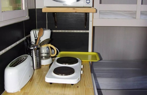 Accommodation: In a space open to nature, quiet: the green shed of 10m2 offers 1 small covered terrace (1 table and 2 chairs) A room consists of 2 bunk beds and 2 pull-out beds. (sleeps and pillows provided) and a kitchenette with refrigerator, electric hobs, dishes, kettle, microwave, toaster. You will find a water point is close to the cabin. Next to the green cabin you will have a picnic table and 2 deckchairs. You will use the collective health of the campsite.