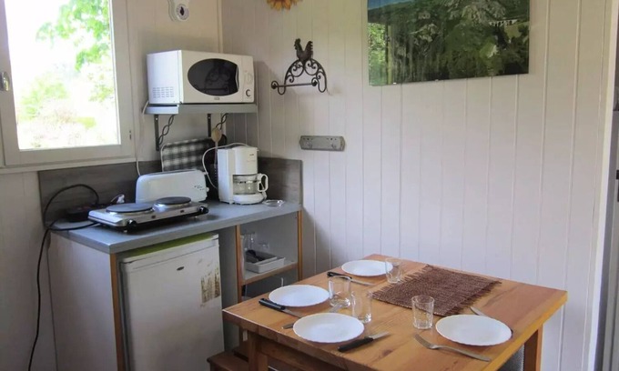 Accommodation: In a space open to nature: the 12 m2 yellow cabin with a bedroom (2 bunk beds) and a room that contains 2 pull-out beds (2x70x190) and a kitchen with fridge, electric hobs, dishes, kettle, microwave, toaster. Outside there is a small covered terrace with 1 table and 2 chairs. You will find a water point is close to the cabin. Next to the yellow cabin, you will have a picnic table and 2 deckchairs. You will use the collective health of the campsite.