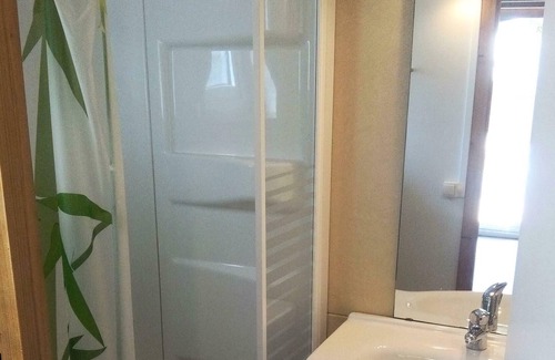 Chalet 3 Rooms 4 Persons 21m ² composed of a living area, a kitchen corner, a bedroom with 1 double bed (140x200), a bedroom with 2 bunk beds (80x200), a bathroom bathroom with shower and toilet. Covered terrace.
