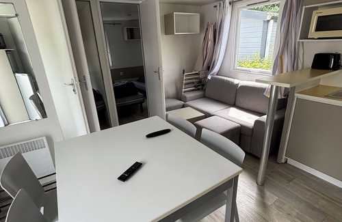 Guest accommodations at Camping La Tentation - Mobil-home Endives offer coffee/tea makers. Rooms open to patios. Accommodations are furnished with dining tables and kitchen islands. Kitchens offer refrigerators, stovetops, microwaves, and separate dining areas. Bathrooms include showers. Housekeeping is provided on request.