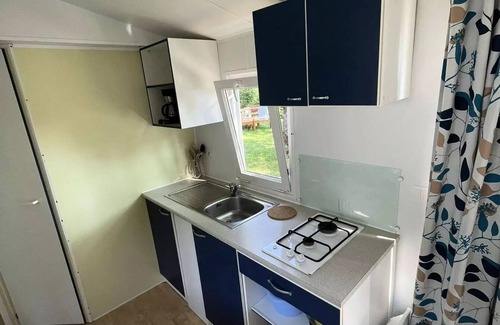 Accommodation: This mobile home of 20m2 from 2002 for 4 people is ideal for family holidays at low prices, it is located in the center of the campsite and the playground. It is equipped with2 bedrooms of which one with one double bed (130*190) and the other with 2 single beds (70*190). One equipped kitchen a freezer refrigerator, 2 gas burners and 1 microwave and all the kitchen equipment for 4 people, there is also a shower room with separate toilet. You will have a large terrace Uncovered wood, equipped with a garden furniture and a parasol. No TV.