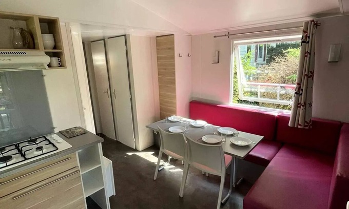 Equipment: The mobile home is equipped with a 4-burner hob, a fridge, a microwave, a coffee maker and all kitchen utensils. Covers and pillows are provided (sheets optional). The terrace has a garden furniture and an umbrella.