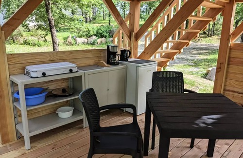 GeneralAreasTotal area (m2) : 10Terrace area (m2) : 15Old ageYear of rental : 2023SituationNeighbourhoodcalmViewcampaign ShavedSanitary closeNear pool ExposureWestFurther informationSmoking accommodation: noDisabled access: noAccommodation GlampingAnimalsAnimals: accepted under conditionswith supplementon requestcompulsory vaccination bookletkept on a leashDogmore than 1 yearDog of 1st class prohibitedDog of 2nd category prohibitedCat not acceptedRooms & BeddingsSeparate rooms : 1BeddingBedding adapted to the number of personsSheets: not providedPillows: providedTraversins: not providedCovers: providedDuvets: not providedKitchenKitchen : 1Kitchen equipmentCooking plates : 2 lights : 1Electric coffee maker : 1Kettle: 1Refrigerator : 1Coffee maker : 1No sinkKitchen cornerHealth facilitiesNo bathroomInterior equipmentMultimedia equipmentWifi CollectivefreeWifi areaExternal equipmentTerrace : 1Semi-coveredBarbecuecollectiveCoalGarden table