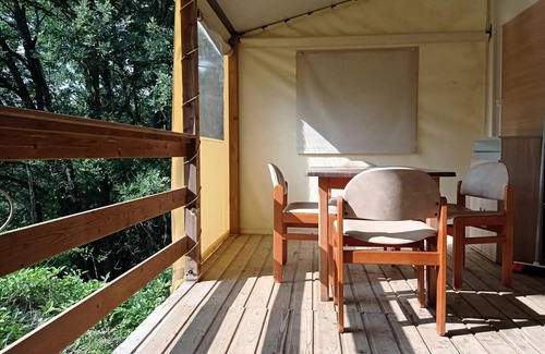 Accommodation equipped with: Mobile home:A bedroom with a double bed in 140x190 cm,A bedroom with 2 beds in 80x190 cm.Part under rigid canvases:A kitchen/dining area with 1 table and 4 chairs.