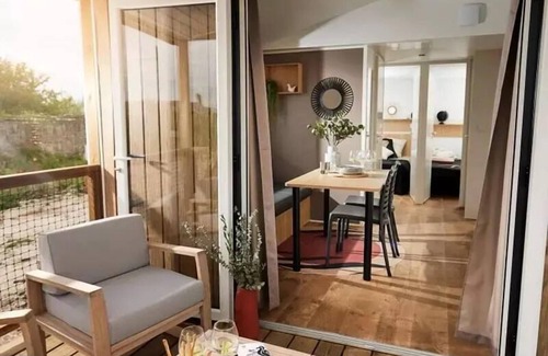 Accommodation: Mobil home 4 people - 2 bedrooms- 1 bedroom with 1 double bed 140x190- 1 bedroom with 2 single beds 80x190Covers and pillows providedKitchen equipped with fridge/freezer, sitting/dining area, 4 gas hobs, microwave, filter coffee maker.Bathroom with washbasin and shower, separate toilet.Reversible air conditioning and television.Built-in covered terrace with table, garden chairs.Non-contractual photos.
