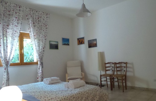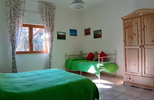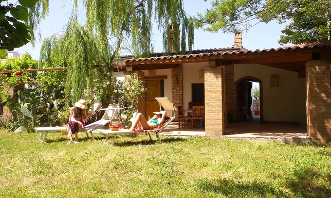 Entirely surrounded by trees and hedges and invisible from the road, you can reach the farmhouse along a long avenue of olive trees immersed in a plot of land of 30 hectares, it will amaze you for the peace and harmony that you can breathe by staying for short or long periods. The guest apartment, completely renovated in 2016, consists of a living room with kitchen and fireplace, two bedrooms and a bathroom with large shower for a total of 5 beds. Guests will have a private garden and a porch, a playground for children, trampoline, a wood oven, parking, various outdoor showers. The garden entirely surrounded by tall hedges is the ideal place also for naturism lovers given the total privacy. Here you can rediscover the pleasure of picking a fruit from a tree, making bread in a wood oven, having breakfast on the porch listening to the birds singing, admiring a beautiful starry sky. Relaxing osteopathic treatments are possible. A washing machine is available for a fee. WiFi is free, as are the use of bicycles and a wood oven. If you love nature and are looking for a place to relax, this is the right place.