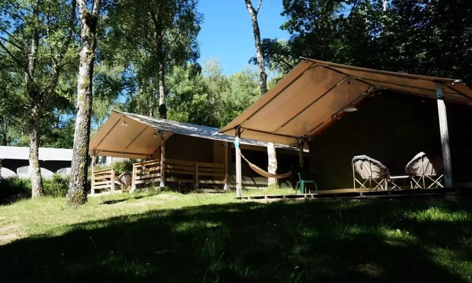 Accommodation: Enjoy a glamping tent holiday with our family tent Freeflower that will provide you with comfort and unique experience close to nature.Our exclusive Flower Campsites tent of 37m2 for 5 people with 2 bedrooms (3 single beds 90 x 190 cm, 1 double bed 160 x 200 cm) will seduce you by its grandeur and its opening on the environment with its large terrace to fully enjoy. Sanitary and bathroom: nearby sanitary block