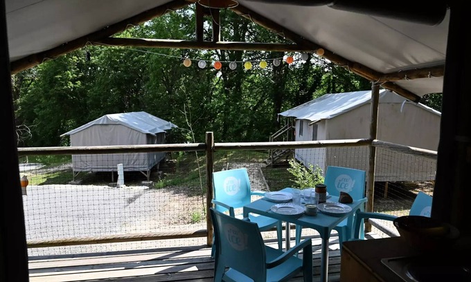 Accommodation: A nice canvas tent on stilts with its small sheltered terrace to enjoy the view of the trees and lake below, for rent from the end of June to the end of August. The accommodation does not have one, you will need to go to the common sanitary of the campsite.However, there is an electric hob for two cookers and a refrigerator with a small freezer compartment. Four beds, one double and two singles with duvets and pillows for serene summer nights. The swimming pool and sanitary facilities are nearby, above, taking a nice soft path, towards the bar-restaurant.
