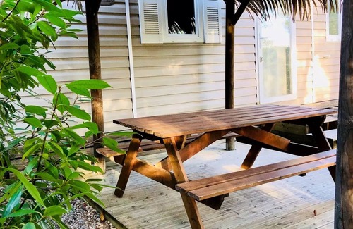 Equipment: The accommodation includes: Television Air conditioner Heating Kitchen area: hotplates, fridge/freezer, microwave, electric coffee maker, crockery/cutlery Duvets and pillows provided Outside: picnic table, deck chair
