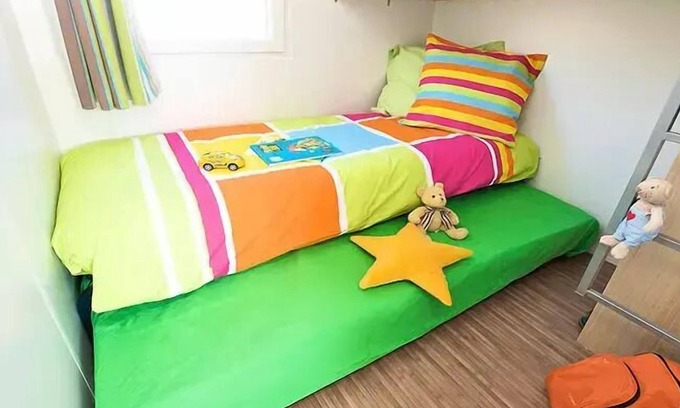Details: Playground for children : Yes Children's animation : From July 6 to August 26, the campsite offers you from Monday to Friday (children's entertainment from 10 a.m.) - Children's club: Open for all children from 4 to 12 years old. Club open from 10 a.m. to 12 p.m. from Monday to Friday in July/August. Family animations : July/August - Monday to Friday Sports animations : Yes Pets allowed : Pets allowed: €4/day - 1 pet maximum allowed per rental - up-to-date vaccination record required - excluding categories 1 and 2 - to be paid on site Barbecue : 5€/day - to be paid on site Deposit (in supplement) Charges (surcharge) Lake / river distance : 0 m Grocery store : open 01/05 to 16/09 Final cleaning fee : Cleaning package €80 - to be paid on site Baby Kit : (travel cot, a bathtub and a baby chair): €10/day - to be paid on site Laundromat : on site by 1€ or 2€ coins Towels : (small and large towel + bath mat) €8 - to be paid on site Bike room Sheets rental : single sheets €12 and double €16 - to be paid on site Number of stars : 4 Breakfast : served at the bar - extra charge Heated pool : open from 01/05 to 15/09 Near airport : Lyon Saint-Exupéry Airport #LYS (114.2 km), Marseille Provence Airport #MRS (165.8 km) Restaurant : from 02/05 to 15/09 - The Champel restaurant offers its children's menu, its traditional menu (pizzas, salads, ravioli, ...) and PIERRADE by reservation only (minimum 4 people, maximum 12 people). For lunch, we offer a snack formula Tourist tax (surcharge) : Tourist tax: €0.61/person from 18 years old/day - to be paid on site Tennis Sin Ping Pong Wi-Fi access Swimming pool Deposit (in euros) : 300 Number of bedrooms : 2 Number of double bed : 1 Number of single beds : 2 Number of pieces : 3 Cooking plate Surface (m²) : 21 Terrace Cooked Pets Allowed : With supplement - Tenus on leash Fridge Microwave oven